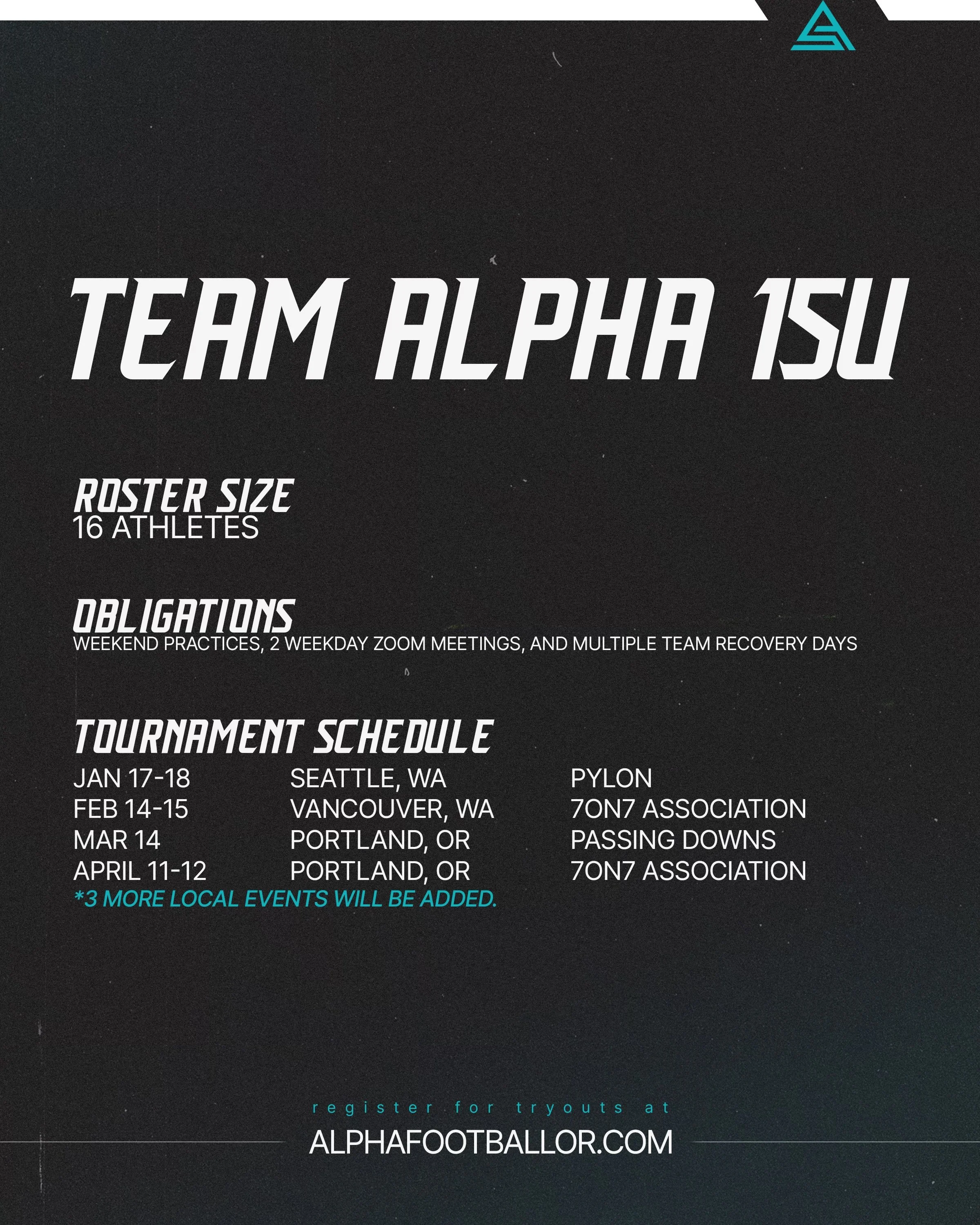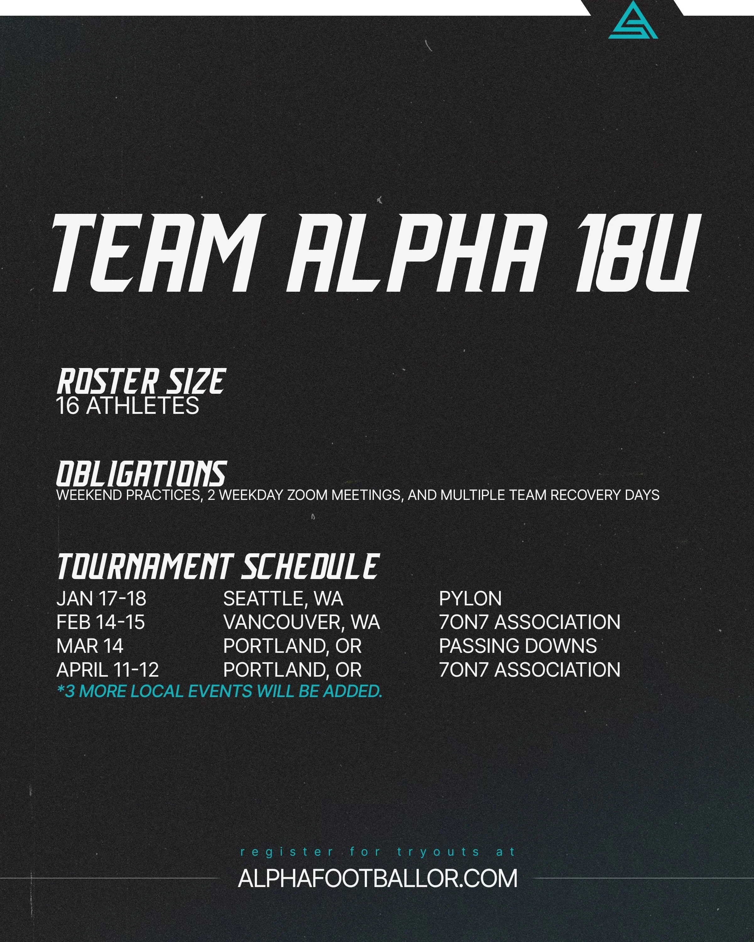 TEAM ALPHA What is Alpha Football? Team Structure Alpha Elite Team Alpha 18u Alpha 15u Alpha 14u Click Here Interested In Alpha Football? Team Alpha X Rokke Performance Therapy